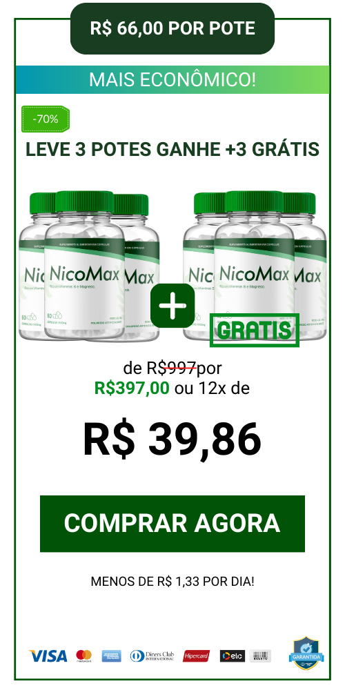 NicoMax possui uma fórmula completa com ingredientes naturais e vitaminas, seu processo de fabricação é único, produzido com nanotecnologia, ele irá agir de dentro para fora, eliminando o mau hábito de fumar.